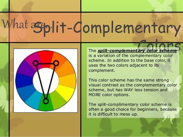 Students will explore creating different split complementary color scheme combinations. Another way of looking at is is to select three analogous colors and then look… The first throw of the die in the color scheme game determines the color scheme, the second throw determines the dominant color. It should be darker that the first color. The next way is to use split complimentaries.